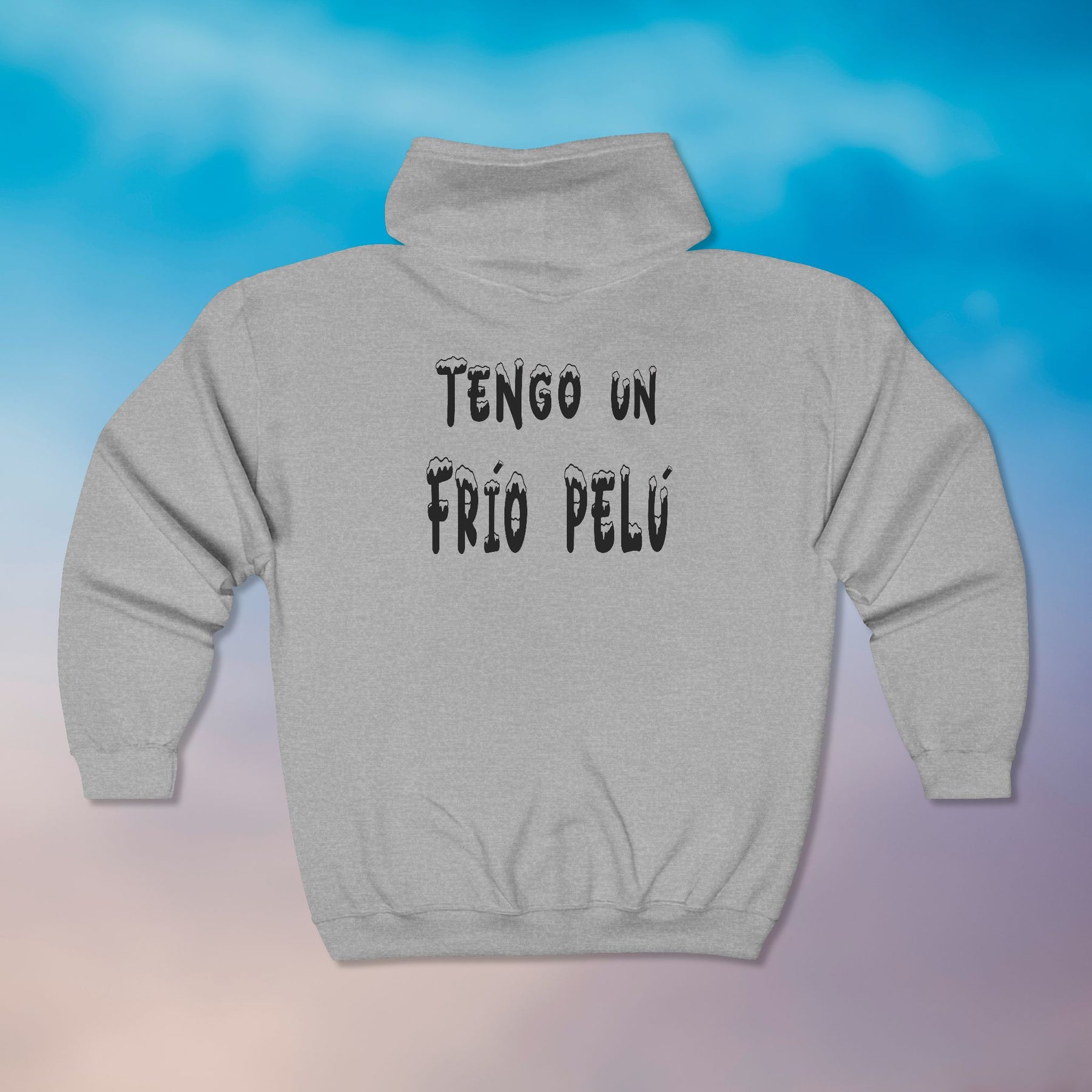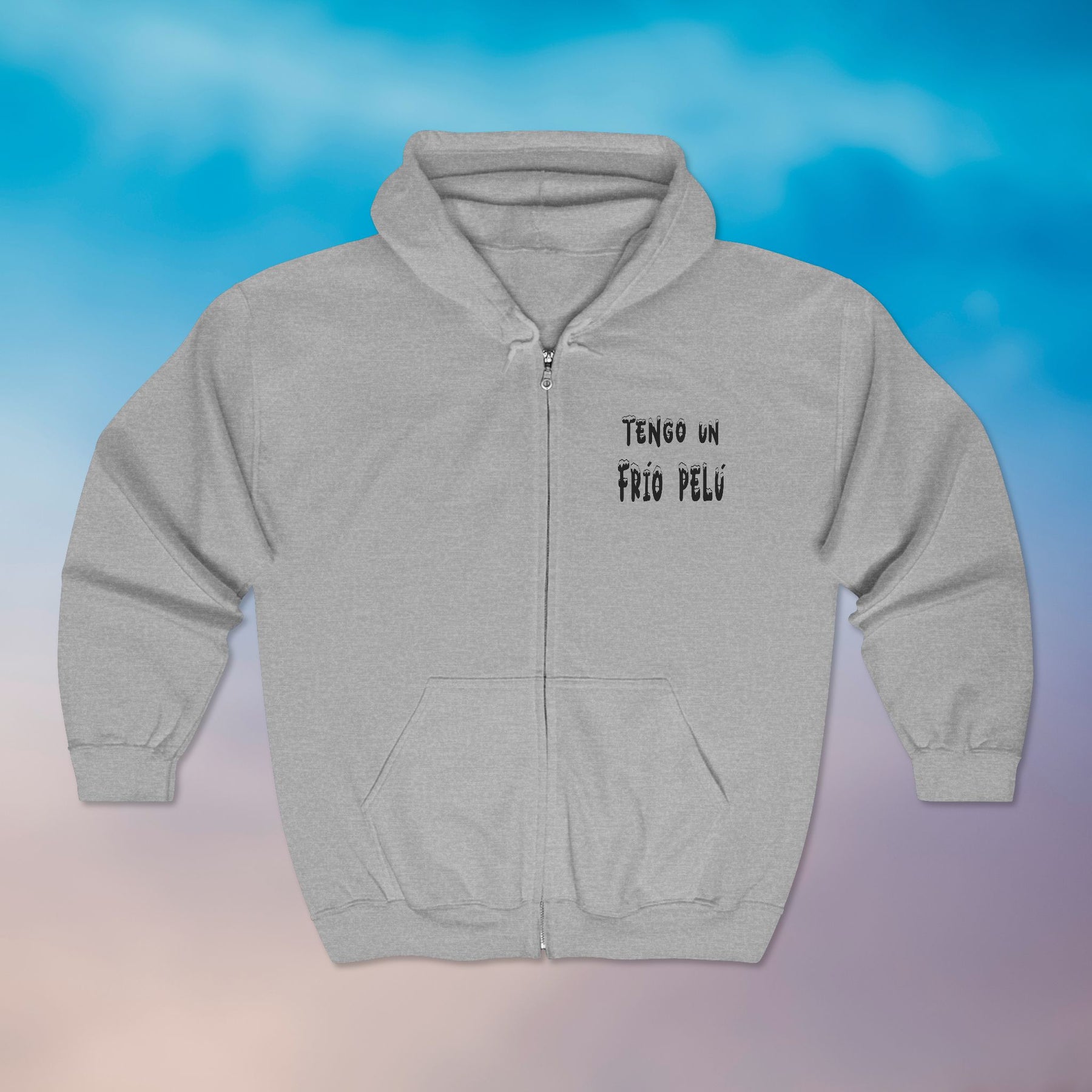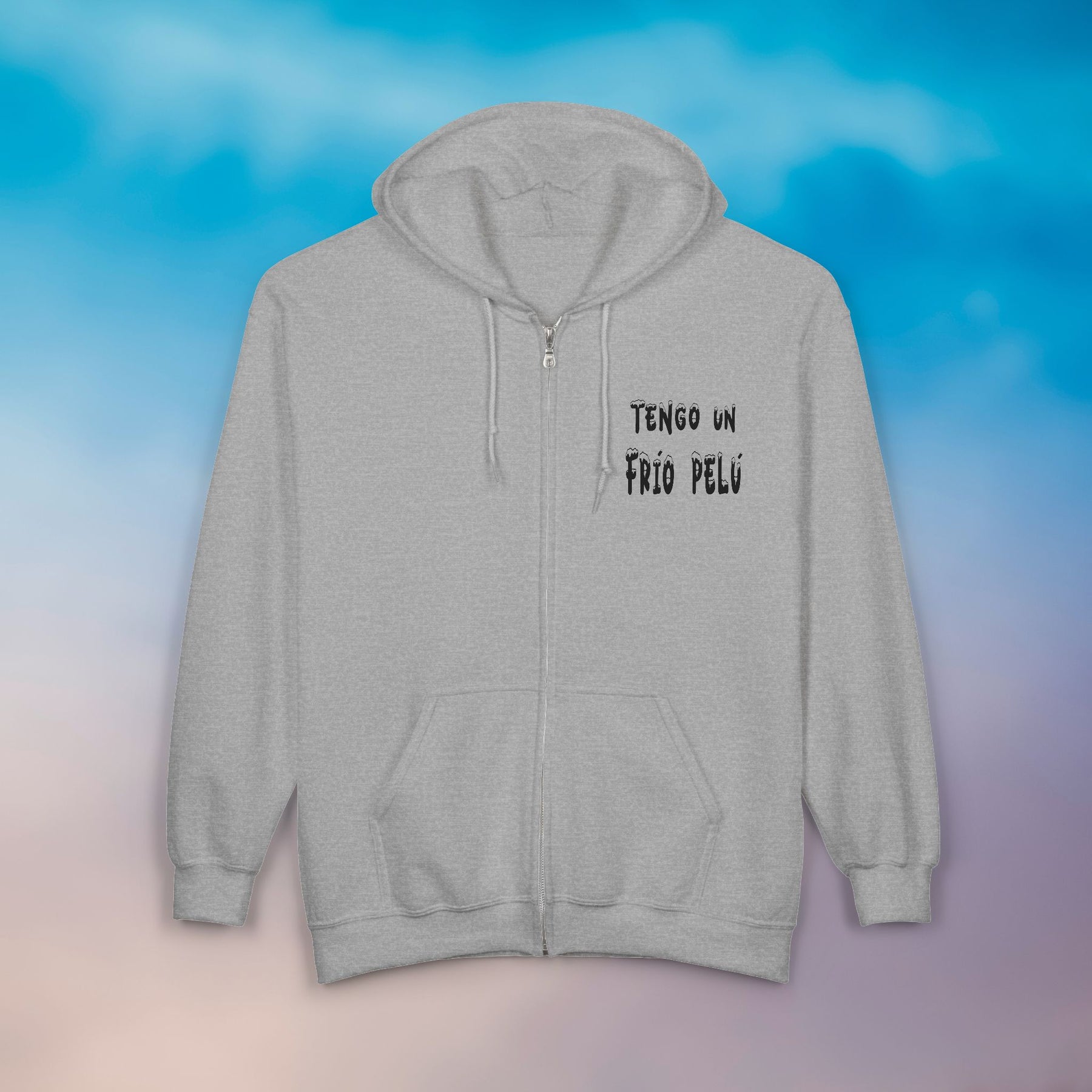 Light, familiar, and quietly bold — this full-zip hoodie feels like slipping into a trusted routine. The soft gray knit holds a playful, hand-lettered message in Spanish: “Tengo un frío pelú,” written small over the heart and larger across the back. It’s the kind of sweatshirt you reach for on chilly mornings, late-night walks, or when you want a comfortable layer that also speaks your mood. The roomy front pockets take the weight of your phone and keys. A structured hood with drawstring and a smooth metal zipper finish the look with clean, durable details. It wears like everyday armor for those who prefer subtle, tongue-in-cheek statements over loud branding.